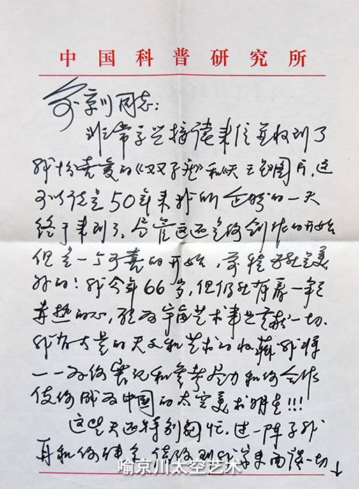 那年(1991年),我将几幅创作的自以为较好的太空美术作品忐忑的寄给了他,希望能得到他的帮助和指点。没想到很快就得到了李元先生的回复,我收到一个厚厚的大信封,里面装了不少有关太空美术的图片资料,以及一封热情洋溢的回信。信中说:“非常高兴接读来信并收到我十分喜爱的两幅作品图片,这可以说是50年来,我所企盼的一天终于来到了,尽管这还是你创作的开始,却是一个可喜的开始……我今年66岁,仍然有着一颗炽热的心,愿为宇宙艺术事业贡献一切……”这一句句充满鼓励和希望的话语令我激动不已。仰慕已久的李元先生终于成了我的老师,这更加坚定了我投身太空美术创作的信心,成为我人生的一个重大转折点。