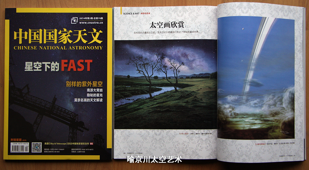 2014年在《中国国家天文》1--3月号上连续三期发表太空美术作品。这是第二期上发表的两幅作品(左图《小河·天河》油画作品,右图《土星环》数字作品)